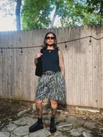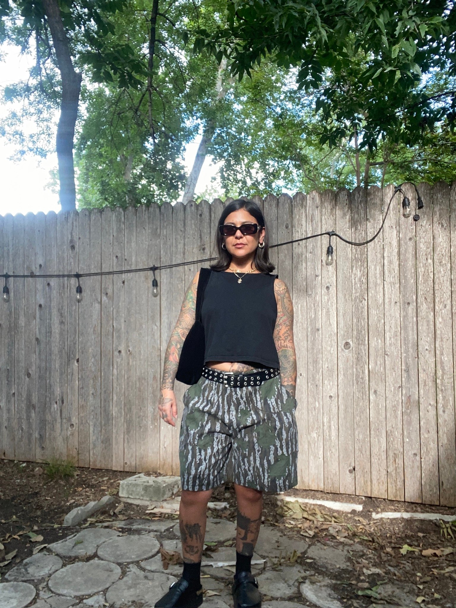 These shorts come equipped with 2 deep front pockets, 1 back pocket, and elastic waist band. With plenty of ease at the hips. Made from a thrifted cotton blend possibly vintage Trebark 80’s or 90’s. they are easy breezy, perfect for the hellish weather.